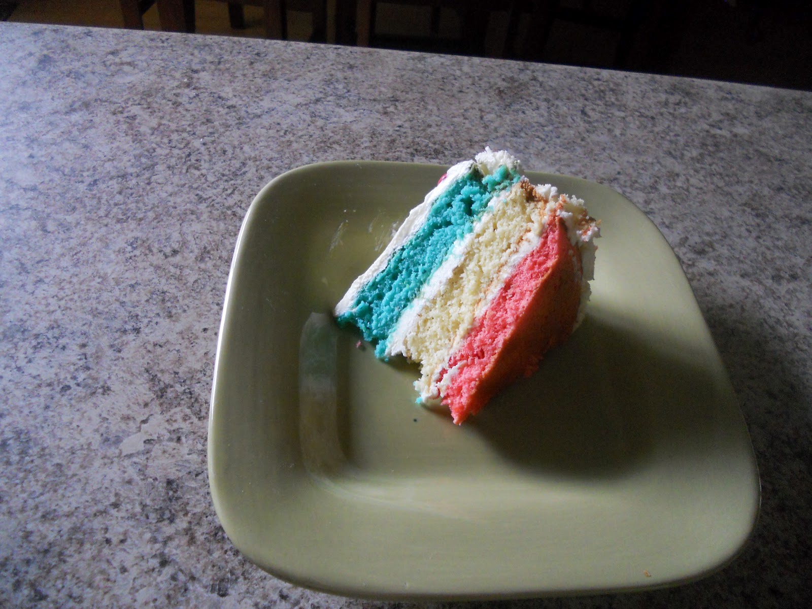 - To decorate, start with the red layer and gently turn over onto a cake plate. Generously frost the top of the red cake, then place the blue cake on top. Frost the blue layer, then top with the white cake; use remaining frosting to frost the top and sides of the cake.